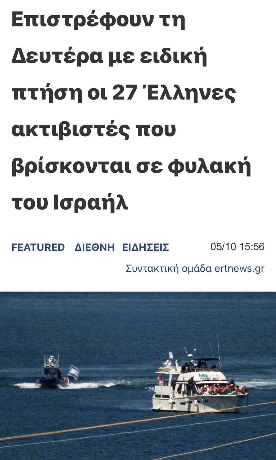 Η ΦΩΝΗ ΛΟΓΙΚΗΣ εκφράζει την έντονη δυσαρέσκειά της για την απόφαση της κυβέρνησης και του υπουργού Εξωτερικών κ. Γεραπετρίτη να οργανώσουν ειδική πτήση για τον επαναπατρισμό των 27 Ελλήνων ακτιβιστών που κρατούνται στο Ισραήλ — με κόστος που, φυσικά, θα επιβαρύνει τους Έλληνες φορολογούμενους.