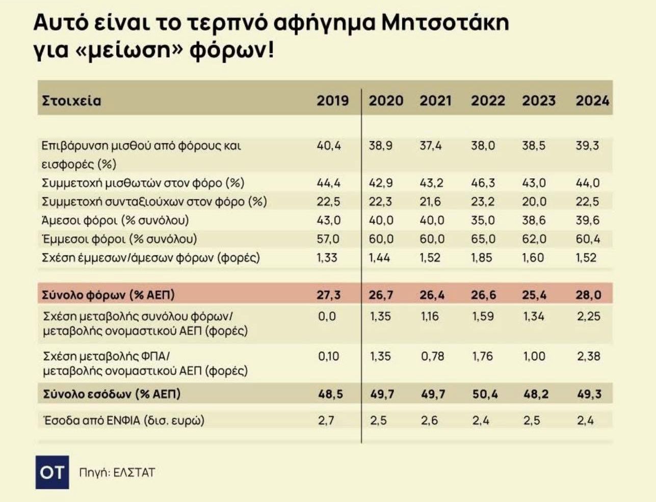 Η αλήθεια δεν κρύβεται, όσο κι αν προσπαθεί ο Κυριάκος Μητσοτάκης να τη θάψει κάτω από επικοινωνιακά «αφηγήματα». Τα στοιχεία της ΕΛΣΤΑΤ και των ίδιων των κρατικών προϋπολογισμών δείχνουν ξεκάθαρα: η κυβέρνησή του όχι μόνο δεν μείωσε τη φορολογία, αλλά την αύξησε σε βάρος μισθωτών, συνταξιούχων και της μεσαίας τάξης.
