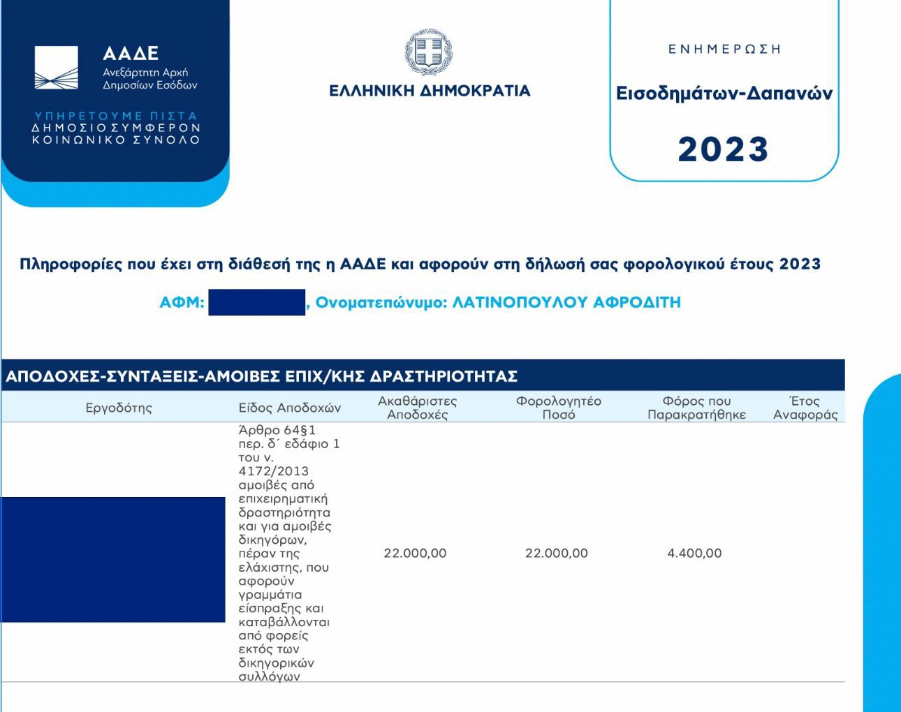 Το έτος 2023 τα συνολικά μου έσοδα, ακαθάριστες αποδοχές από επιχειρηματική δραστηριότητα ανήλθαν σε 22.000 ευρώ.