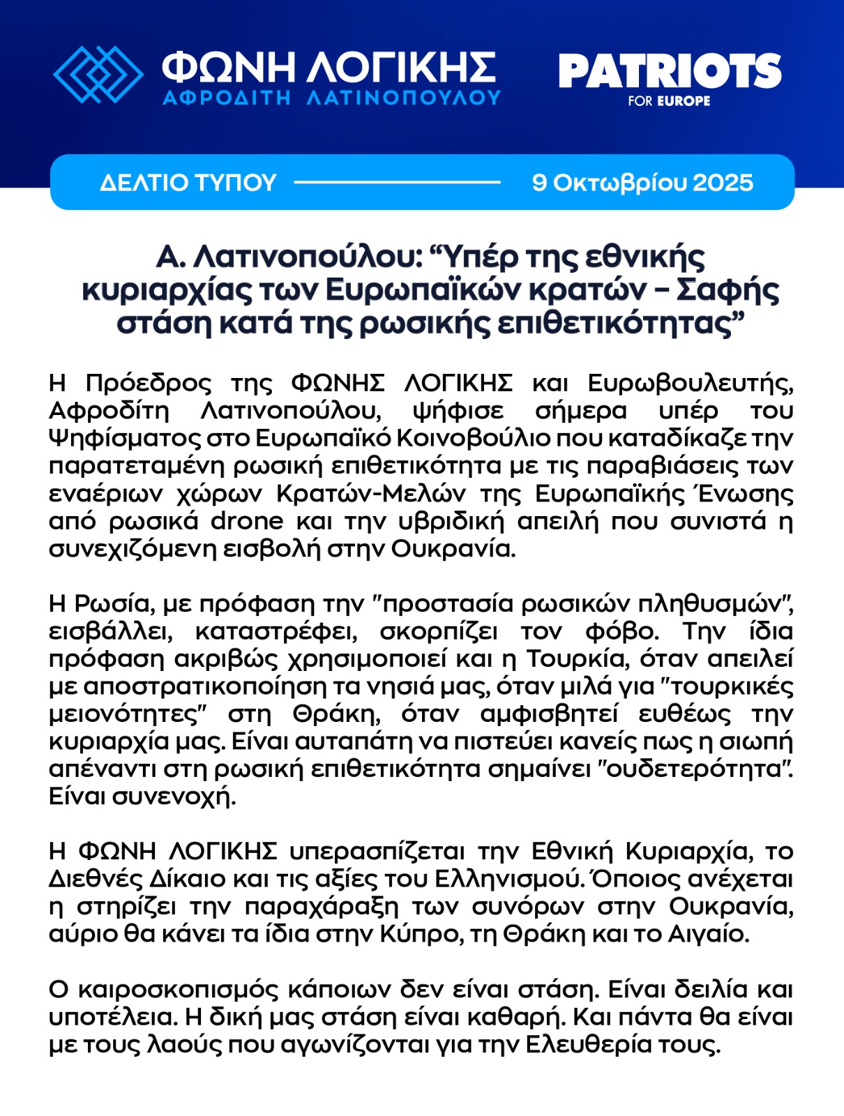 Η Πρόεδρος της ΦΩΝΗΣ ΛΟΓΙΚΗΣ και Ευρωβουλευτής, Αφροδίτη Λατινοπούλου, ψήφισε σήμερα υπέρ του Ψηφίσματος στο Ευρωπαϊκό Κοινοβούλιο που καταδίκαζε την παρατεταμένη ρωσική επιθετικότητα με τις παραβιάσεις των εναέριων χώρων Κρατών-Μελών της Ευρωπαϊκής Ένωσης από ρωσικά drone και την υβριδική απειλή που συνιστά η συνεχιζόμενη εισβολή στην Ουκρανία.
