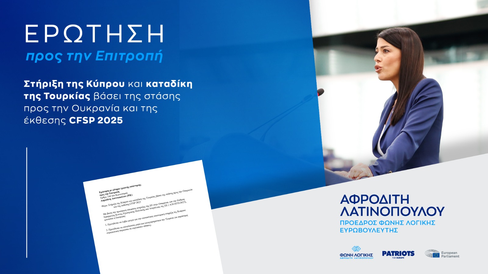 Η Πρόεδρος της ΦΩΝΗΣ ΛΟΓΙΚΗΣ και Ευρωβουλευτής, Αφροδίτη Λατινοπούλου, κατέθεσε γραπτή ερώτηση προς την Ευρωπαϊκή Επιτροπή, ζητώντας αφενός ουσιαστική οικονομική στήριξη της Κυπριακής Δημοκρατίας και αφετέρου ρητή και κατηγορηματική καταδίκη της Τουρκίας για την παράνομη στρατιωτική της παρουσία σε ευρωπαϊκό έδαφος, στη βάση των ίδιων αρχών που διέπουν τη στάση της ΕΕ απέναντι στην Ουκρανία.